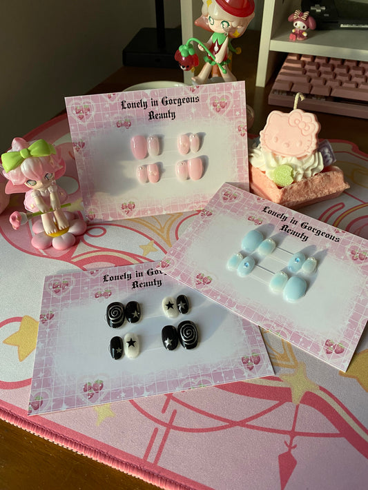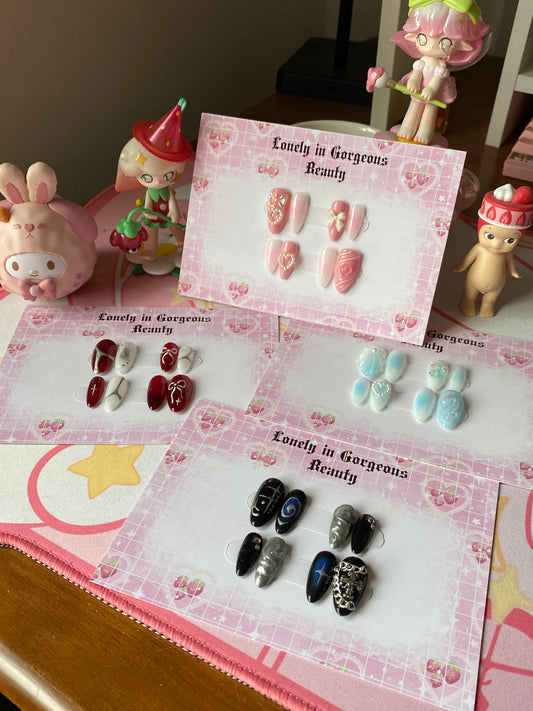 Customise your press-on set with your favourite character! There are 4 base designs in medium almond length that you can customise with your favourite anime character, K-pop star or video game character. Available in small, standard and large sizes. Please refer to our sizing chart or order a sizing kit if you are uncertain about your sizes.